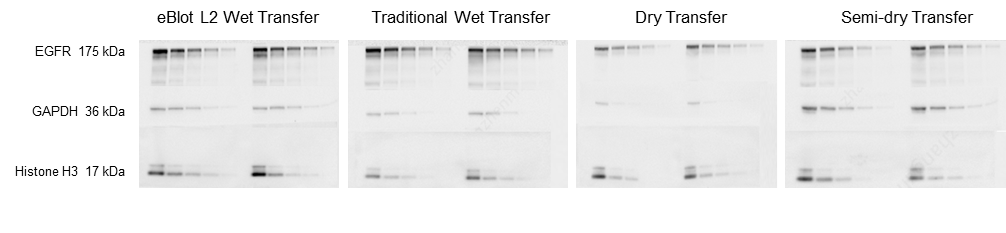 eBlot L2 outperforms other market available transfer methods, particularly for the large molecular weight proteins.